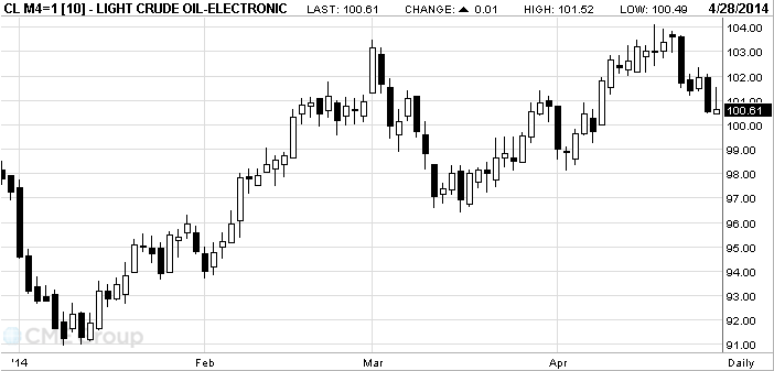 p.m. London time. Prices dropped 1.3 percent to $100.60 on April 25, the lowest