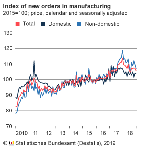 Domestic orders decreased by 0.6% and foreign orders fell by 2.3% in December 2018 on the previous month. New orders from the euro area were up 3.2%, new orders from other countries decreased 5.5% compared to November 2018.