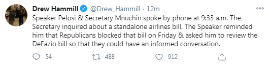 "The House & Senate should IMMEDIATELY Approve 25 Billion Dollars for Airline Payroll Support, & 135 Billion Dollars for Paycheck Protection Program for Small Business. Both of these will be fully paid for with unused funds from the Cares Act. Have this money. I will sign now!", Trump tweeted. "If I am sent a Stand Alone Bill for Stimulus Checks ($1,200), they will go out to our great people IMMEDIATELY. I am ready to sign right now. Are you listening Nancy?", he added in a separate tweet.