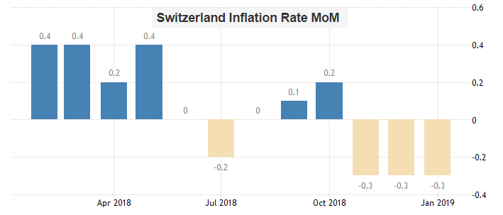 According to the report from Federal Statistical Office (FSO), the consumer price index (CPI) fell by 0.3% in January 2019 compared with the previous month, reaching 101.3 points (December 2015 = 100). Inflation was 0.6% compared with the same month of the previous year.