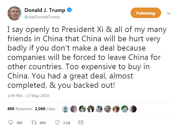 Analysts at the Royal Bank of Scotland note that the U.S. president Donald Trump upped the ante in the U.S.-China trade talks last week, hiking tariffs on $200 billion worth of Chinese goods from 10% to 25%.