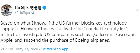Meanwhile, China's Global Times editor-in-chief tweeted that "if the U.S. further blocks key technology supply to Huawei, China will activate the "unreliable entity list", restrict or investigate US companies such as Qualcomm, Cisco and Apple, and suspend the purchase of Boeing airplanes".