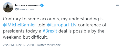 Reuters reports that Home Secretary Priti Patel said that the UK will work flat out for a Brexit trade deal and negotiators are in “tunnel” negotiations but if a deal with the European Union is not possible then the country will be prepared.