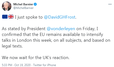 “The lack of pound weakness strongly suggests that market participants continue to believe that a trade deal will be reached and are not overly concerned by the latest political posturing. Michael Barnier and David Frost are expected to seek a way out of the latest Brexit impasse when they meet today.”