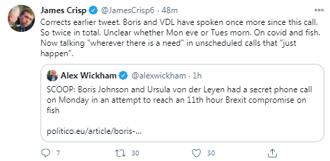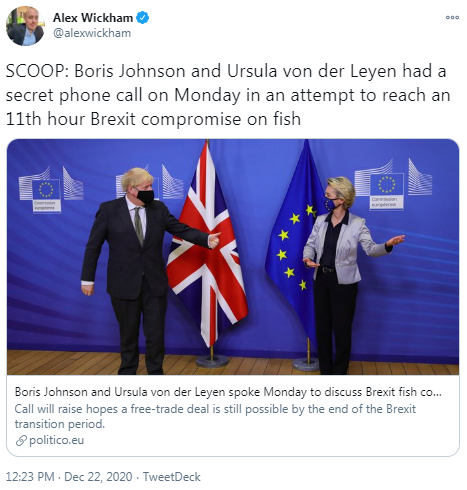 Reports that the UK's prime minister Boris Johnson and the European Commission's president Ursula von der Leyen held a phone call on Monday, trying to reach compromise in trade talks heightened hopes that the two sides could strike a deal before the end of the Brexit transition period on December 31. Politico's editor reported, citing an unnamed official familiar with the conversation, that the two leaders spoke about fresh proposals to resolve the existing stalemate on fisheries. But the UK's government official told Politico that the EU position was still miles off what was acceptable to them. Meanwhile, Reuters reported that EU sources said that the bloc was now willing to accept a reduction in the value of its catch in the UK waters of up to 25% over a period of time from 2021.