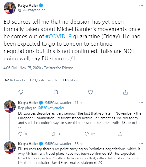 Reuters reports that the head of the European Union's executive reported "genuine progress" in Brexit talks but said the risk of Britain leaving the EU without a deal on Dec. 31 remained, an outcome she said the bloc was prepared for.