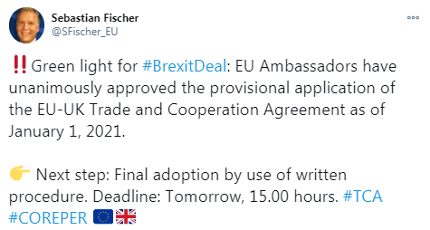 Meeting in Brussels on Friday, the Committee of permanent representatives (Coreper) of the EU countries approved a letter to the European Parliament that the EU Council will decide on the temporary validity of the EU agreement with the UK, Coreper spokesman Sebastian Fischer said.