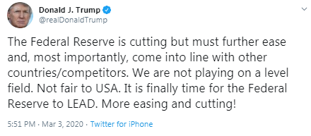 In its statement, the Federal Reserve said: "The fundamentals of the U.S. economy remain strong. However, the coronavirus poses evolving risks to economic activity. In light of these risks and in support of achieving its maximum employment and price stability goals, the Federal Open Market Committee decided today to lower the target range for the federal funds rate by 1/2 percentage point, to 1 to 1‑1/4 percent. The Committee is closely monitoring developments and their implications for the economic outlook and will use its tools and act as appropriate to support the economy."