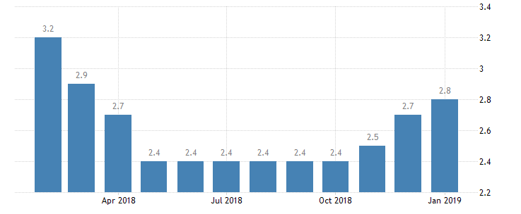 The unemployment rate rose from 2.7% in December 2018 to 2.8% in the month under review. Compared with the same month of the previous year, unemployment fell by 25,199 persons (-16.9%).