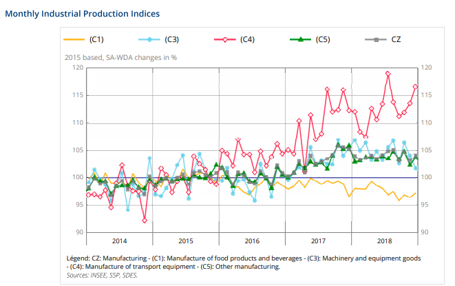 Manufacturing output of the last quarter diminished compared to the same quarter of 2017 (−1.5%), as well as in the whole industry (−1.4%). Over a year, output also decreased sharply in “other manufacturing” (−1.9%), in the manufacture of machinery and equipment goods (−1.4%), in the manufacture of food products and beverages (−1.4%), in mining and quarrying, energy, water supply (−0.9%) and more markedly in the manufacture of coke and refined petroleum products (−7.1%). On the contrary, it increased slightly in the manufacture of transport equipment (+0.4%).