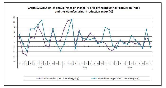 The average Overall Industrial Production Index for the period from January to December 2018 recorded an increase of 1.0% compared with the average IPI of the period from January to December 2017/