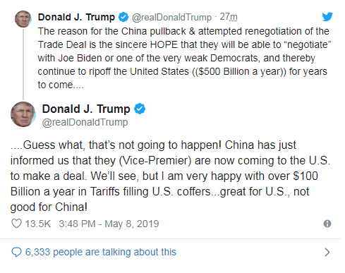 Investors are concerned that the United States and China will not be able to resolve the trade agreement dispute before new tariffs are introduced on Friday that threaten Trump. According to Reuters, Chinese officials have abandoned key trade deal agreements previously reached, undermining hopes that the Chinese delegation, led by Deputy Prime Minister Liu He, will be able to save the deal this week.