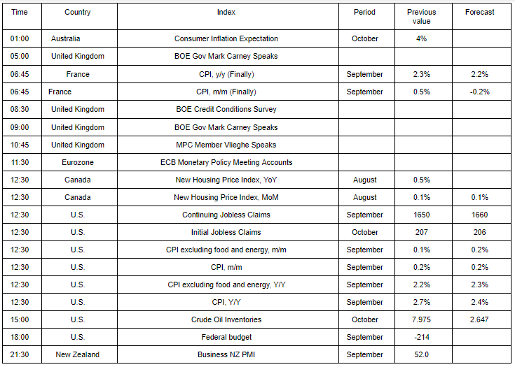 The focus of market participants was also data on the United States. According to a report by the Department of Labor, US producer prices rose 0.2% in September, which followed an unexpected decline in August and was in line with expectations. The rise in prices for services outweighed a slight drop in commodity prices. In August, the final demand price index fell by 0.1%. For 12 months to September, the producer price index rose by 2.6%, which is slightly less than expected. Economists had forecast a PPI growth of 0.2% for the month and an increase of 2.8% on an annualized basis. Last month, a key indicator of producer prices, which excludes services in the field of food, energy and trade, grew by 0.4%, which is the largest increase since January. For 12 months to September, the main PPI rose by 2.9%, as in the previous month.