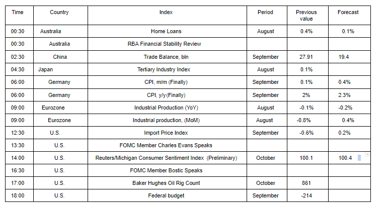 Pressure on the market also had weak inflation data for the United States. The Labor Department reported that consumer prices rose slightly in September, a sign that inflationary pressure remains under control, as a strong dollar holds import prices, while energy costs are declining. The consumer price index in September rose by 0.1% after rising in August by 0.2%. Economists had expected consumer prices to rise by 0.2%, while base prices would also rise by 0.2%. Excluding unstable food and energy categories, so-called basic consumer prices rose by 0.1%, which corresponds to the same pace as in August.
