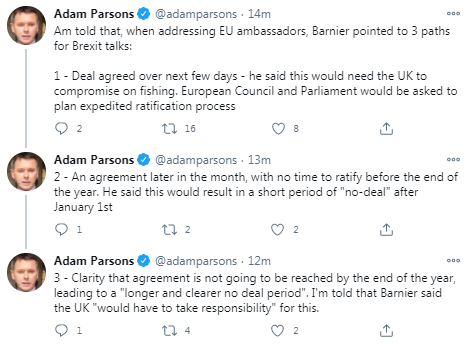Reuters reports that Michel Barnier, the European Union's Brexit negotiator, said that sealing a new trade pact with Britain was still possible and that negotiations are continuing to attempt to solve rifts over access to UK fishing waters and rules of economic fair play for companies.