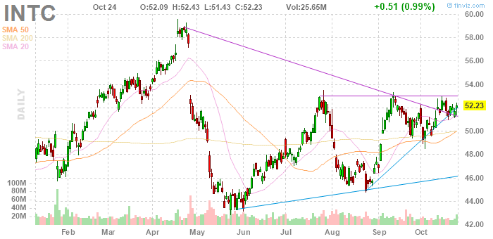 INTC rose to $54.20 (+3.77%) in pre-market trading.