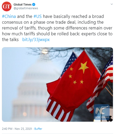 China and the United States are 'very close' to a phase one trade deal, the Global Times, a tabloid run by the ruling Communist Party's official People's Daily, said.