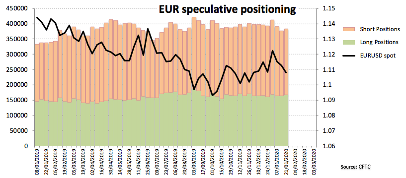 "Dollar speculative buying remains subdued in general, although EUR/USD net positioning appears to be stuck in a tight range again as low appetite for the common currency prevents it from taking advantage of USD selling. It must be noted that the data does not cover the European Central Bank meeting on Thursday 23 January, which triggered a drop in the pair."