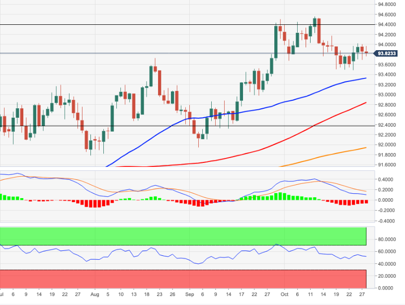 US Dollar Index (DXY) rebound aim for another battle with the 94.00 threshold during early Thursday. The greenback gauge dropped for the first time in three days the previous day as cautious sentiment weighed on the US Treasury yields. However, the following recovery moves fail to regain traction amid a wait-and-watch mode of the markets ahead of the preliminary US Q3 GDP and monetary policy meeting of the European Central Bank (ECB).