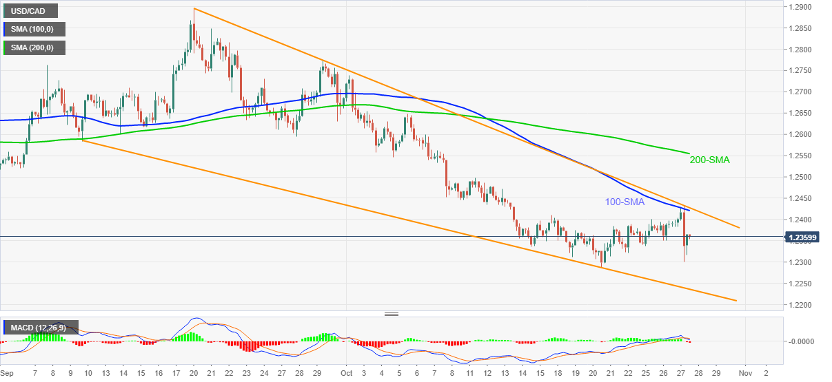 As the corrective pullback remains below 100-SMA and the upper line of a seven-week-old falling wedge bullish chart pattern, amid bearish MACD, USD/CAD prices are likely to remain pressured.