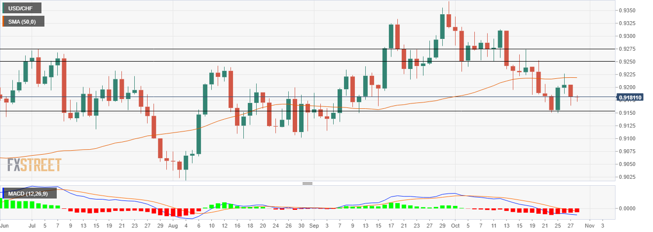 On the daily chart, after testing 5-month highs at 0.9368 on September, 30, the pair has been under downward pressure.The pair dropped below the critical 0.9275 support area. Further, the spot trades the 50-day Simple Moving Average (SMA) at 0.9217.