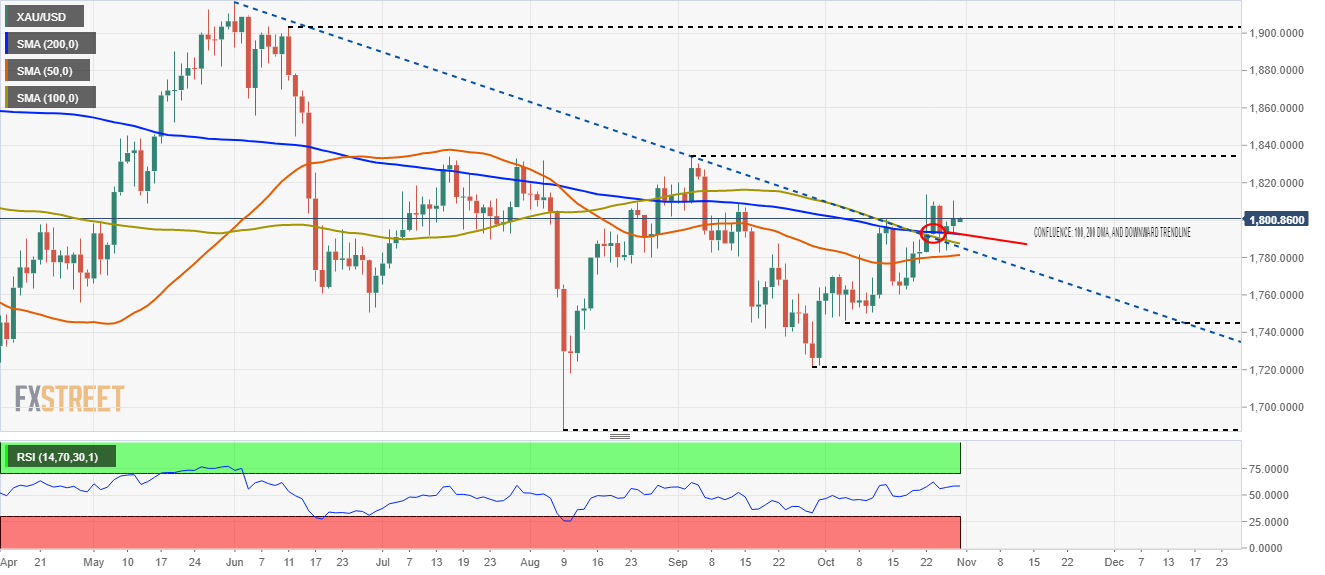 Gold (XAU/USD) spot price is above the confluence of the 100 and 200-day moving average (DMA) and on Tuesday broke a downward slope trendline previously resistance-turned-support, which could be viewed as a bullish signal. The Relative Strength Index (RSI) is at 58, aims slightly low, but as it remains above the 50-midline, it is bullish for the yellow metal.