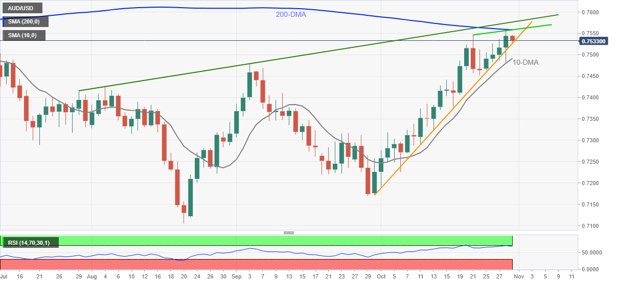 AUD/USD bulls need to conquer the 200-DMA level surrounding 0.7560 to reject odds of dropping back below the monthly support line, around 0.7530 by the press time. That being said, bullish MACD and firmer RSI line, not overbought, favors the pair buyers.