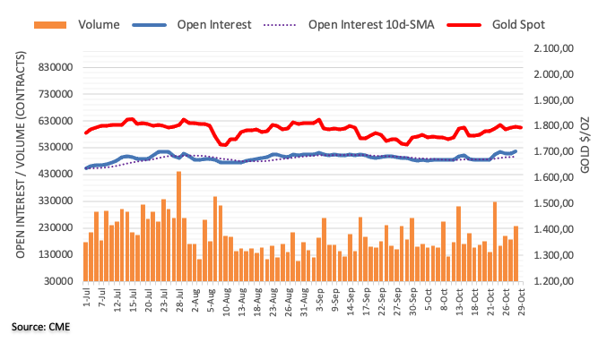 Gold (XAU/USD) daily chart depicts the yellow metal has been up-trending steadily, in ranges of $20.00 average. The 100 and the 200-day moving averages (DMA’s) are above the spot price. Meanwhile, gold is testing the 50-day moving average at $1,780, which, if broken to the downside, confirmed by a daily close underneath it, could propel USD bulls to open fresh bets, in the possibility of a trip towards the September 29 low at $1,721.