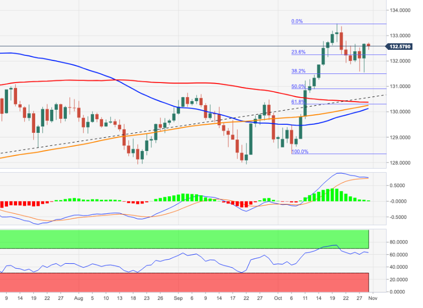 On the upside, the pair should break above 157.10 where the October 28 high meets the 50-period SMA in the 4hr chart. Above here, the pair would regain bullish traction to extend towards 157.75 (Oct. 26 high) and then 158.20 (Oct. 20, 21 highs).