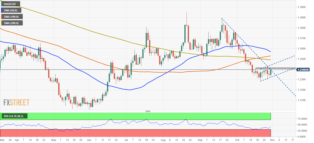 The USD/CAD pair is testing the top of a bearish flag, around 1.2400, which also confluences with a downslope trendline traveling from September 20 high towards September 29 high that the pair is testing at press time.