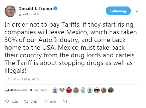 Trump announced Thursday that his country plans to impose a 5% tariff on all Mexican imports from June 10. In a statement, he attributed that unexpected move to a “border crisis”.
