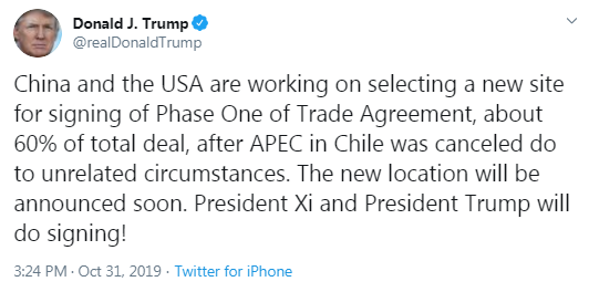 However, Trump said on Twitter that the two countries will soon announce a new venue where the Phase 1 trade deal will be concluded after Chile’s authorities canceled the APEC summit on November 16-17.