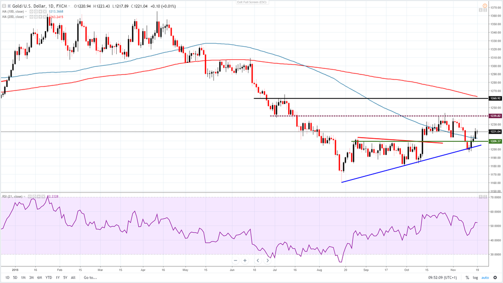 On the downside, the support is probably at the 100-day moving average at 1,213 USD and then it could move to the major bullish trend line near 1,206 USD. As long as gold trades above these levels, the short-term outlook still seems positive.