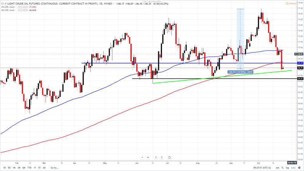 The price dropped below the important level of 67.25 USD, where previous lows were converged with the 200-day moving average. The trend, therefore, switched to bearish and oil is now officially located in the correction territory, as the commodity is down 14 per cent from its October highs.