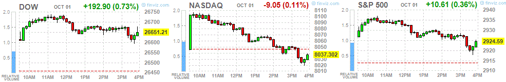 | DJIA | +192.90 | 26651.21 | +0.73% |