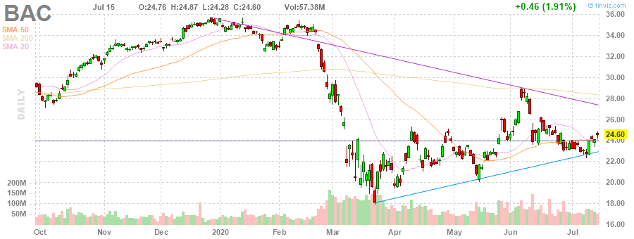 Bank of America (BAC) reported Q2 FY 2020 earnings of $0.37 per share (versus $0.74 per share in Q2 FY 2019), beating analysts’ consensus estimate of $0.28 per share.