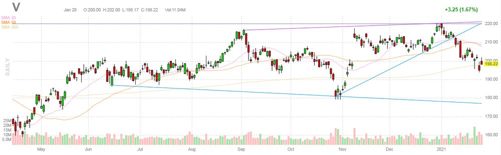 V rose to $199.45 (+0.62%) in pre-market trading.