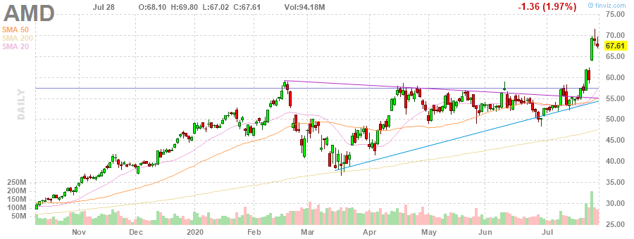 Advanced Micro (AMD) reported Q2 FY 2020 earnings of $0.18 per share (versus $0.08 per share in Q2 FY 2019), beating analysts’ consensus estimate of $0.17 per share.