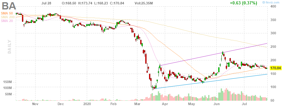 Boeing (BA) reported Q2 FY 2020 loss of $4.79 per share (versus -$5.82 per share in Q2 FY 2019), much worse than analysts’ consensus estimate of -$2.63 per share.