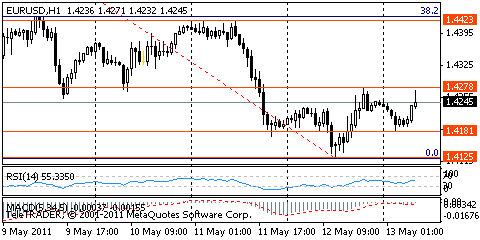 EUR/USD: пара показала минимумы в области $1,4130 после чего выросла и завершила сессию в районе $1,4240.