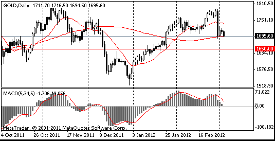 В данный момент цена золота составляет $1698.70 за тройскую унцию (-0.65%). Поддержку оказывает МА(100) для D1, которая в данный момент находится на $1693.60. Преодоление данной поддержки откроет дорогу к $1650.