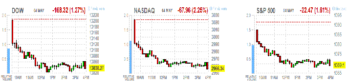 Нисхождение индексов продолжается уже третий день кряду, и основной темой пока остается состояние американского рынка труда. На днях разочаровывал индикатор занятости ADP, а сегодня негативом для участников торгов стали ключевые данные по занятости в несельскохозяйственных отраслях за апрель - показатель увеличился на 115 тыс, т.е. еще слабее, чем месяцем ранее, и существенно слабее средних ожиданий. Занятость в обрабатывающей промышленности выросла лишь на 16 тыс по сравнению с 37 тыс месяцем ранее. Средняя почасовая зарплата в апреле стагнировала (нулевое изменение после роста на 0,2% месяцем ранее), а уровень безработицы снизился с 8,2% до 8,1%, однако в силу особенности расчетной формулы показателя само по себе это снижение далеко не всегда свидетельствует об улучшении ситуации на рынке труда - в данном случае такое изменение было связано с банальным сокращением количества людей, ищущих работу.