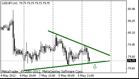 В случае медвежьего сценария пара, преодолев линию поддержки фигуры, может снизится к Y79.40 (123.6% FIBO Y80.60-Y79.65). Далее возможно падение к ключевому уровню поддержки Y79.00.