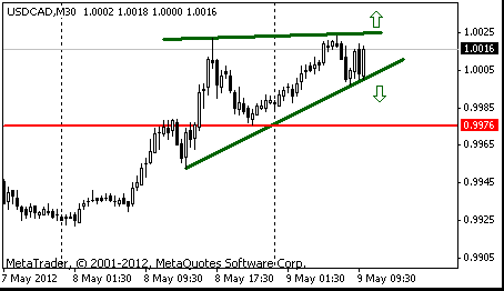 В случае пробития линии поддержки фигуры пара может снизится к C$0.9976 (минимум американской сессии 8 мая).
