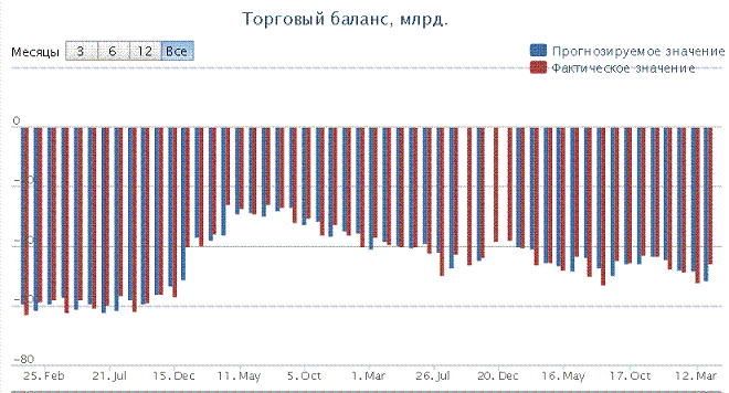 Согласно средним прогнозам, показатель по результатам марта ожидается на уровне -49,6 млрд $, по сравнению с –46 млрд $ в прошлом месяце.