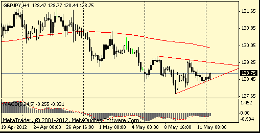 Если пара преодолеет поддержку в области нижней границы треугольника, то может быть достигнута область Y127,80 (минимум прошлой недели) и далее Y127,00 (минимум апреля).