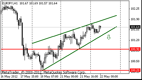 В случае закрепления пары ниже уровня поддержки фигуры, возможно дальнейшее снижение к Y100.90 (минимум 21 мая, 50.0% FIBO Y101.75-Y100.20). Далее возможно снижение к Y100.20 (минимум 18 мая).