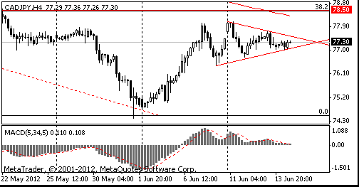 Более вероятным является прорыв верхней границы треугольника, которая ограничивает рост пары в области Y77.50.