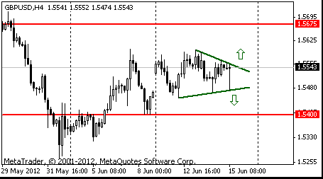В случае закрепления цены выше уровня сопротивления, возможен рост к $1.5675 (123.8% FIBO $1.5265-$1.5600). Если же произойдет пробитие линии поддержки фигуры, то падение может продлится к $1.5400 (минимум 8 июня).