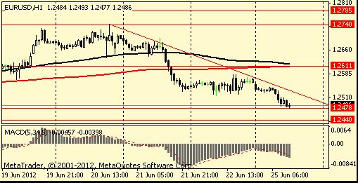 Европейская валюта снова оказалась под давлением в понедельник на фоне ожиданий аукционов по гособлигациям Испании и Италии, которые пройдут завтра, а также в связи с отсутствием в участников рынка уверенности в том, что по итогам грядущего саммита ЕС, который намечен на 28-29 июня, будут приняты какие-либо важные меры, которые позволят справится с региону с долговым кризисом и замедлением экономического роста.